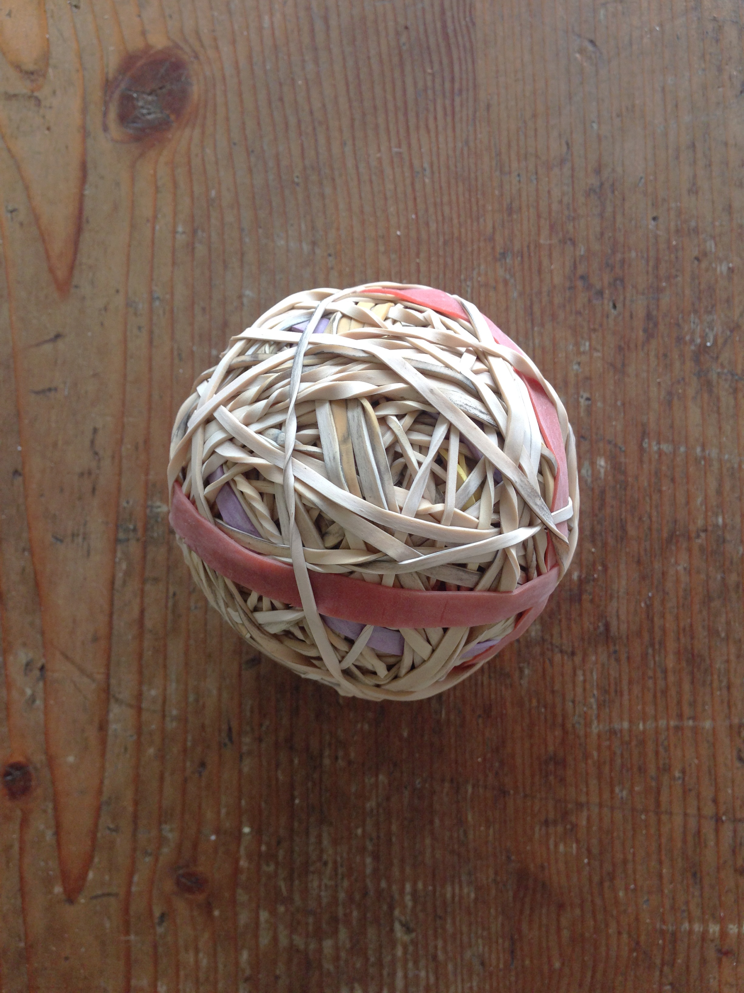 Lately, I’ve applied some urgency to this process of discarding things as my Minimalist Monument to Moi has taken shape. There just won’t be room for much of my stuff. Even so, I occasionally see my tendency for gathering creeping back into my life. For example, here’s a rubber band ball that has been steadily growing to the size of a cricket ball in my kitchen.