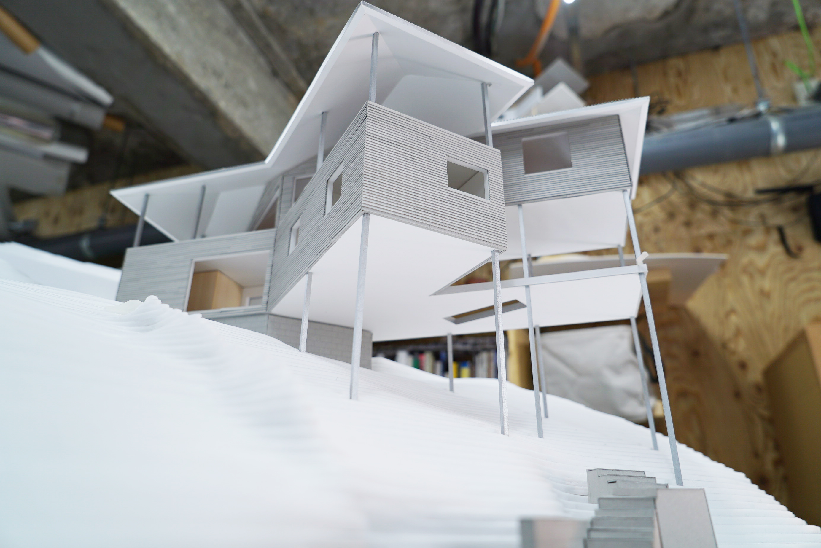 And here’s another series of shots, of the latest almost complete scale model of the entire house, built to reflect the changes in the site now that we’ve had to remove so much fill. This is how the building will now sit on the drastically changed topography of the hill.