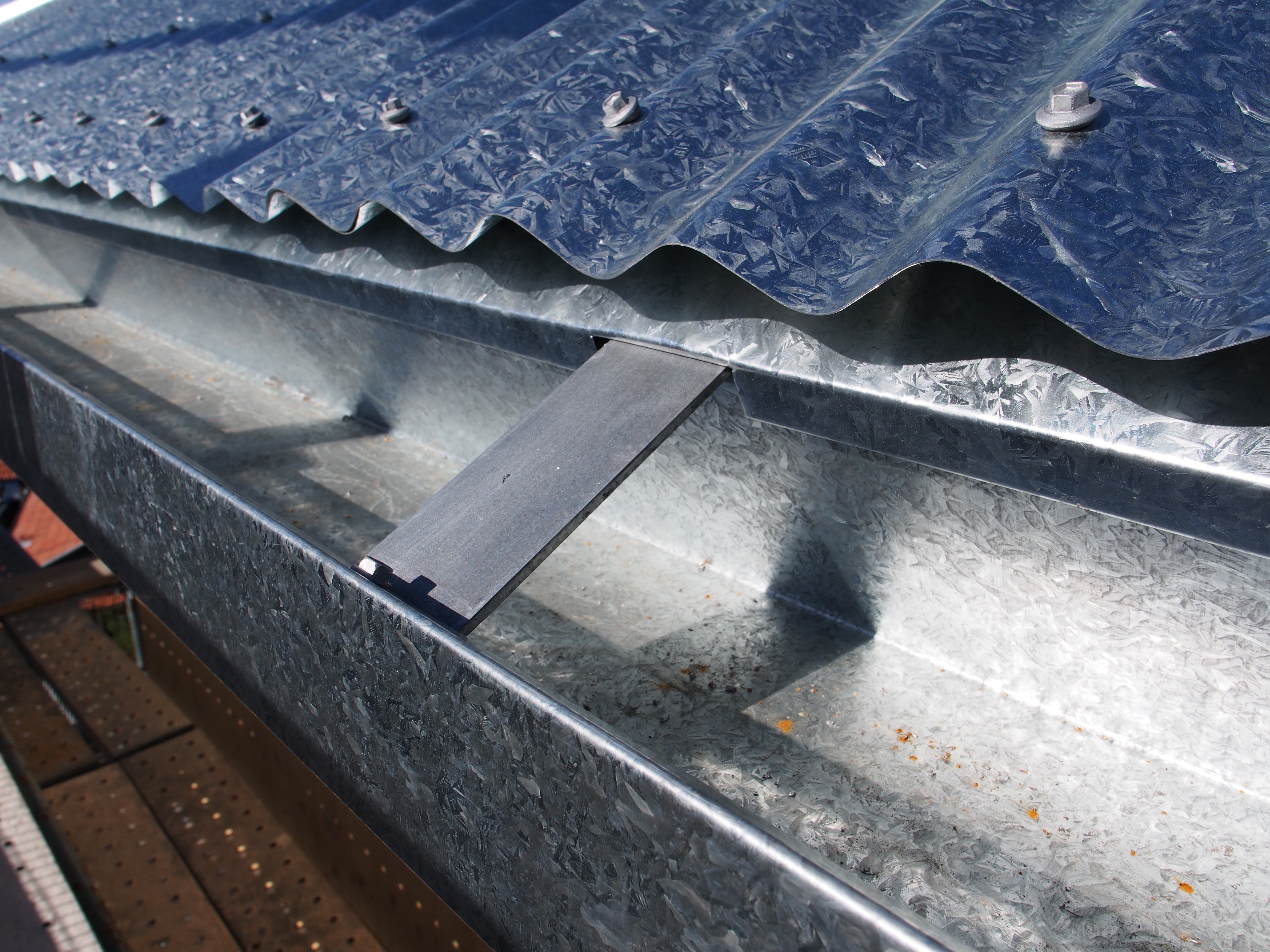 Brilliant! Well, only half brilliant actually, because what the design doesn’t account for is an allowance for any blowback of rain under the lip of the top sheet of steel. With traditional guttering design, this wouldn’t be a problem because the profile of the gutter wouldn’t follow the line of the roof. It would angle square to the ground so the roofing sheet would essentially dip into the gutter and the runoff rainwater would aim beneath the lip of the gutter, which would sit higher than the top edge of the roofing sheet.