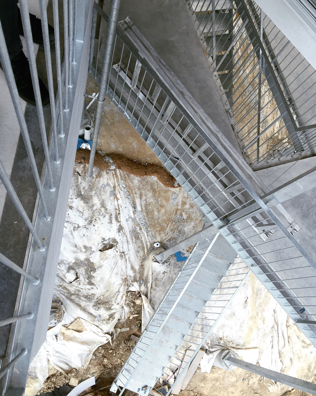 Meanwhile, I had always expected the underside of the lower slab to be the major statement, with its shiny surface and stair snaking up through the hatch in the floor. I didn’t count on the space above that deck exerting itself so much. But with the scaffolding gone, the negative space between the entry deck and the floor above it was drawing my eye through its refined emptiness.
