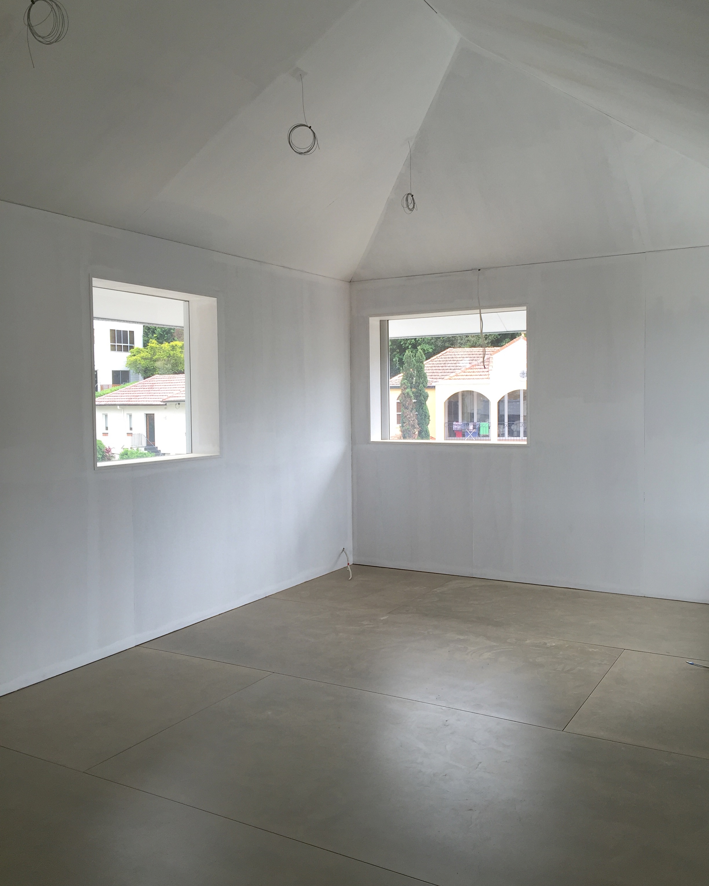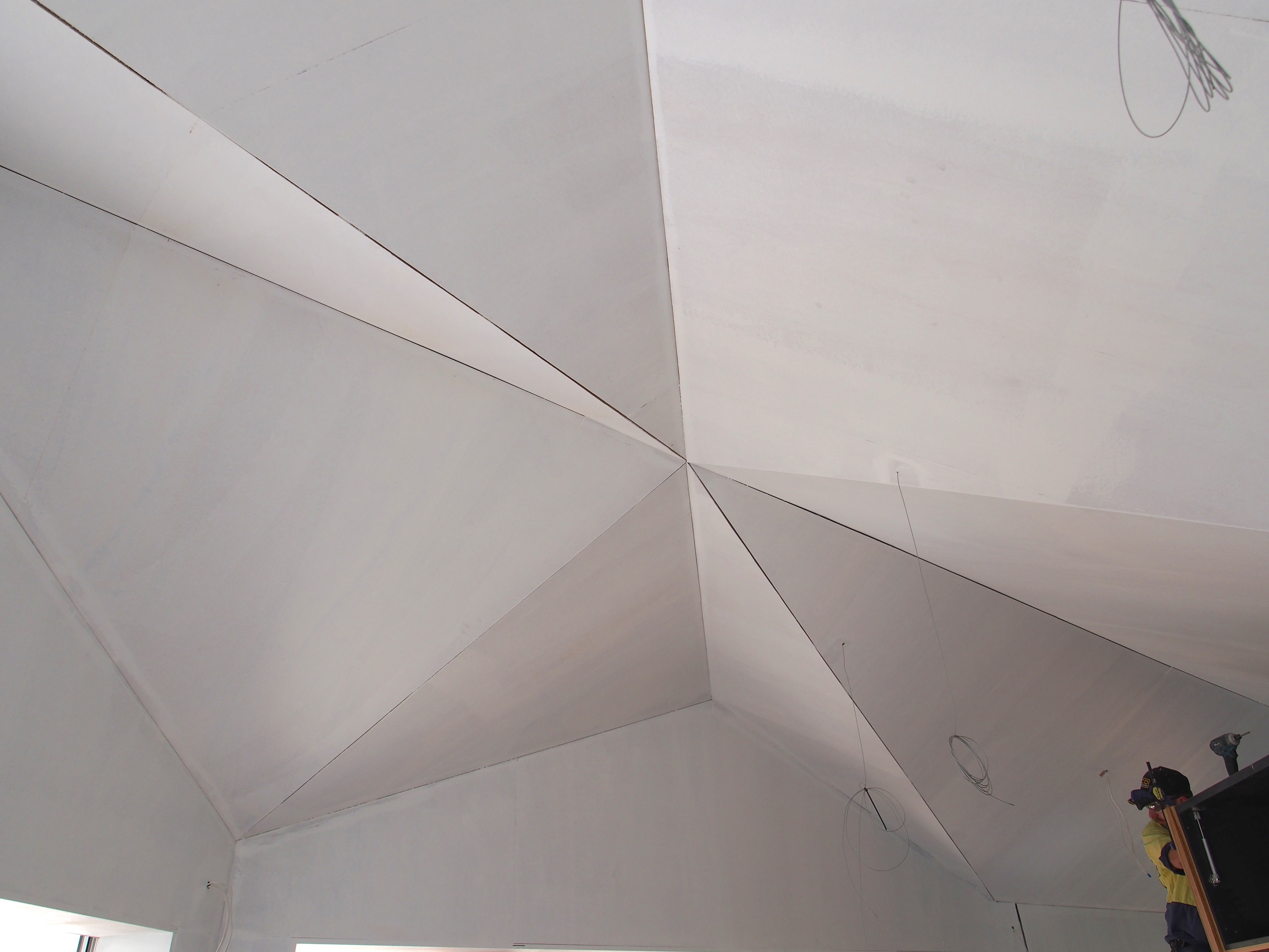 It’s not me doing all this, but I can’t help feeling sorry for the guys who are. However, there are times in a build where you’ve got to know where to put the effort. You can give way on things that won’t be seen over time (like the fixing detail on the Barestone ceiling soffits, which no longer grate on me). But you need to imagine where the eye of the visitor will go when they see the house for the first time. We’ve all heard the first impressions cliché. In my mind, this house will be judged on the virtues of the stair design, the exposed concrete slab, and the feature ceiling on the upper floor, all things you notice first about the building.