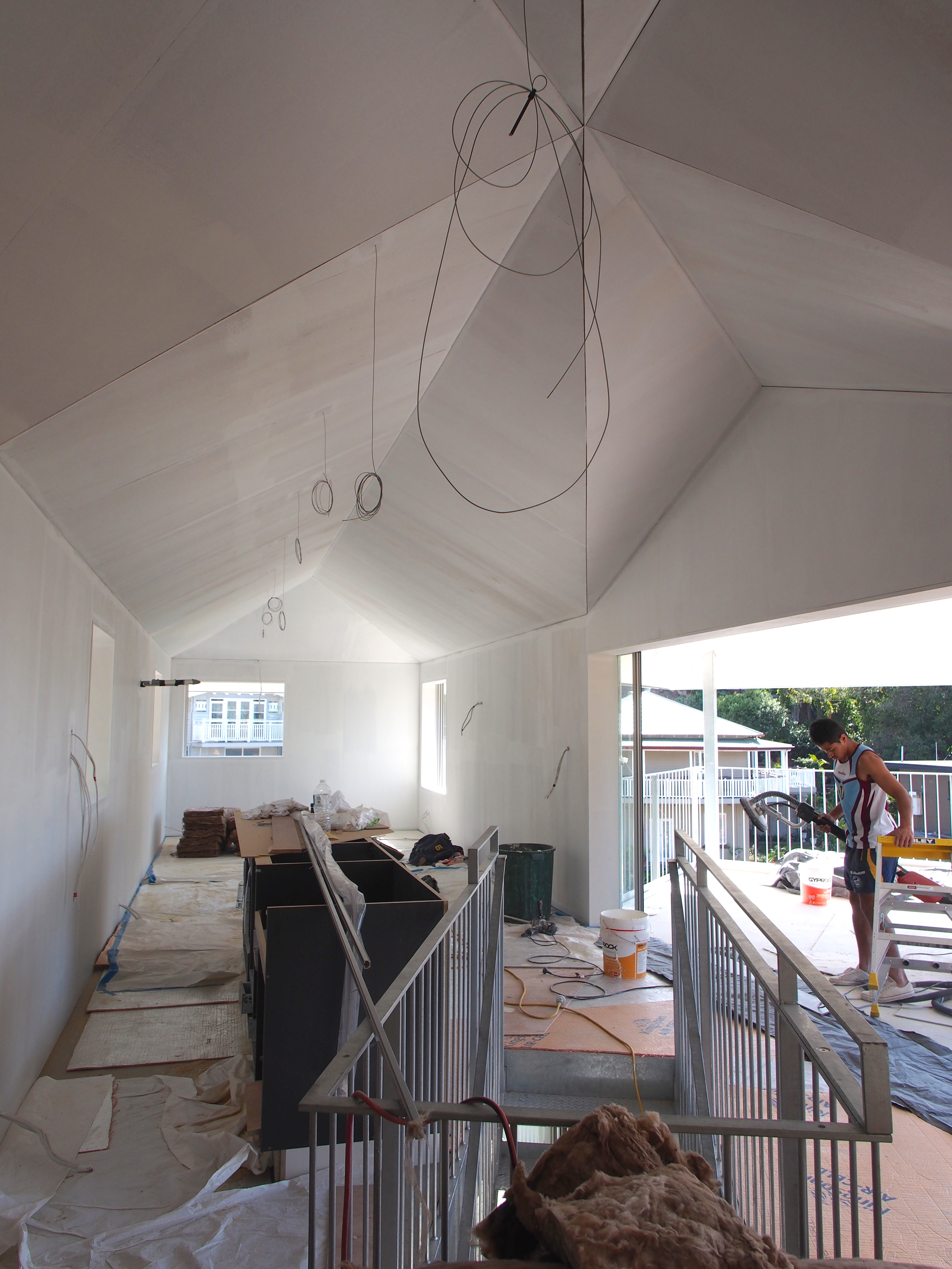 The second issue that needed to be resolved was the painting and filling of the feature ceiling on the upper floor. It’s been very controversial having to paint this ceiling. The ply that was used to build it was of such fine quality that it begged to be left as a timber finish. However, Shimada san’s design required it painted, and painted white at that.