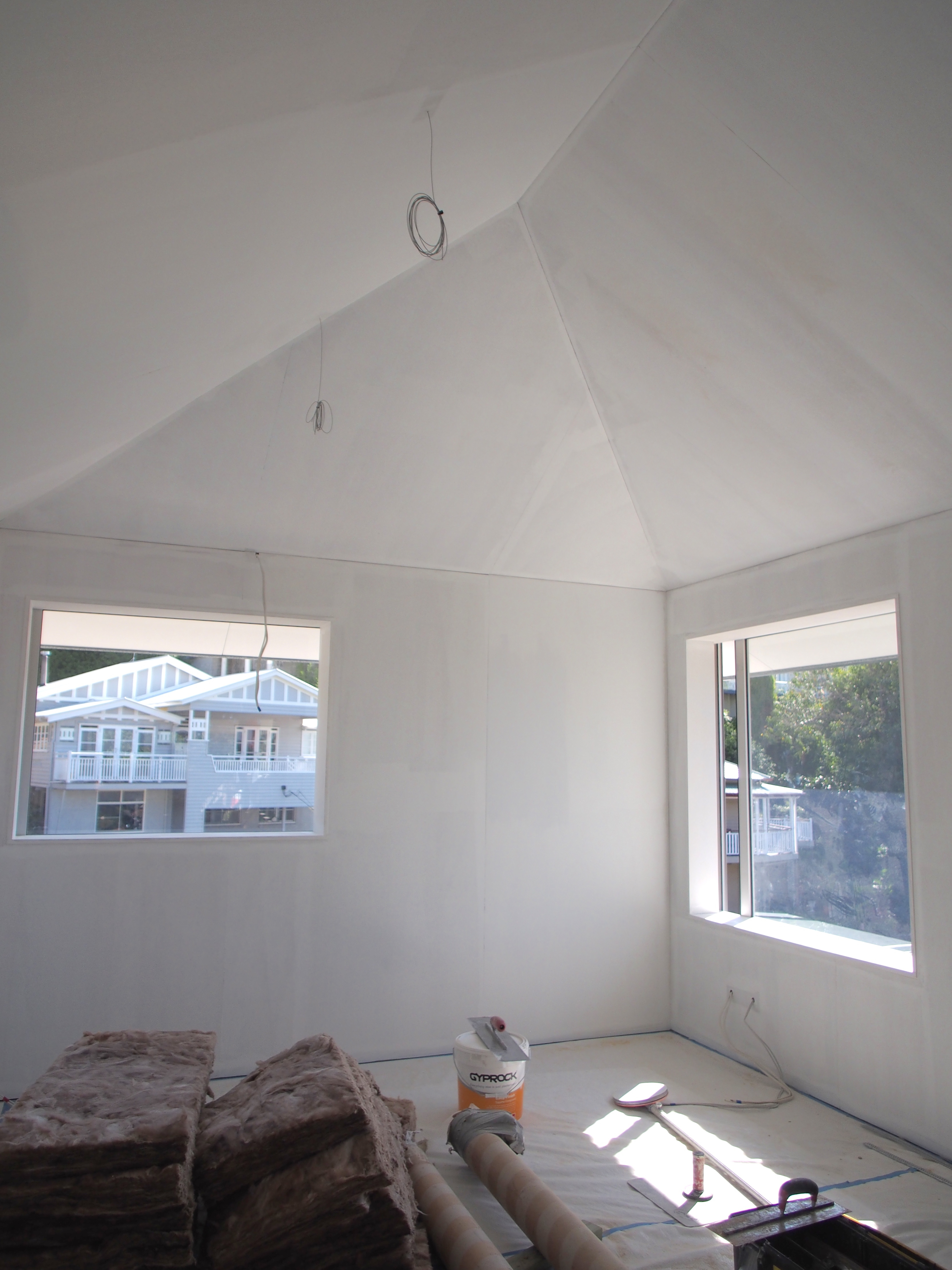 Painting things matt white creates just as many negatives as it does positives. Where a matt white surface will hide small imperfections and variations in surface texture (positive) it also brings into high relief any obvious joins (negative…very negative). The joins in the plywood walls, I’m told, will always be there, even beneath a few coats of white. I’ll talk about the virtues of that later. Meanwhile, in the spaces along the ridges and valleys where the ceiling is at its most complicated, there are gaps which will need to be filled.