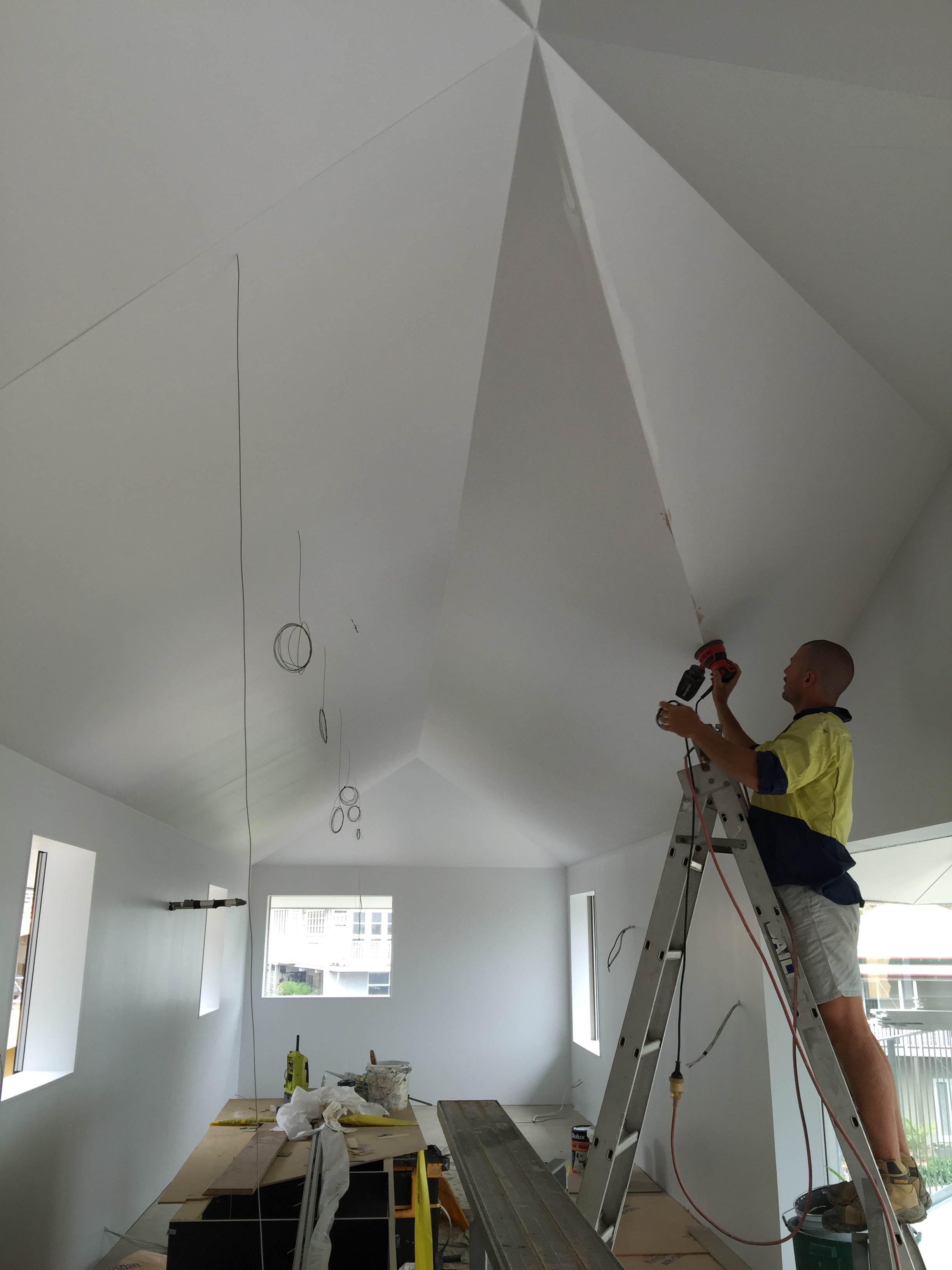The experts tell us that silicone joints are the way to go here because they’re flexible and stay put during the heave and breathe of temperature changes. Yet silicone doesn’t deliver a sharp joint, more of a concave effect. The settle-and-live-with-it approach would be to fill all the joints, paint over them, and try not to notice them later. If you’re going to be a champion of the design however, the approach is more complicated. It requires sanding and filling, sanding and filling, building up the edges and then sanding them again on angles to achieve a peak where the ceiling folds.