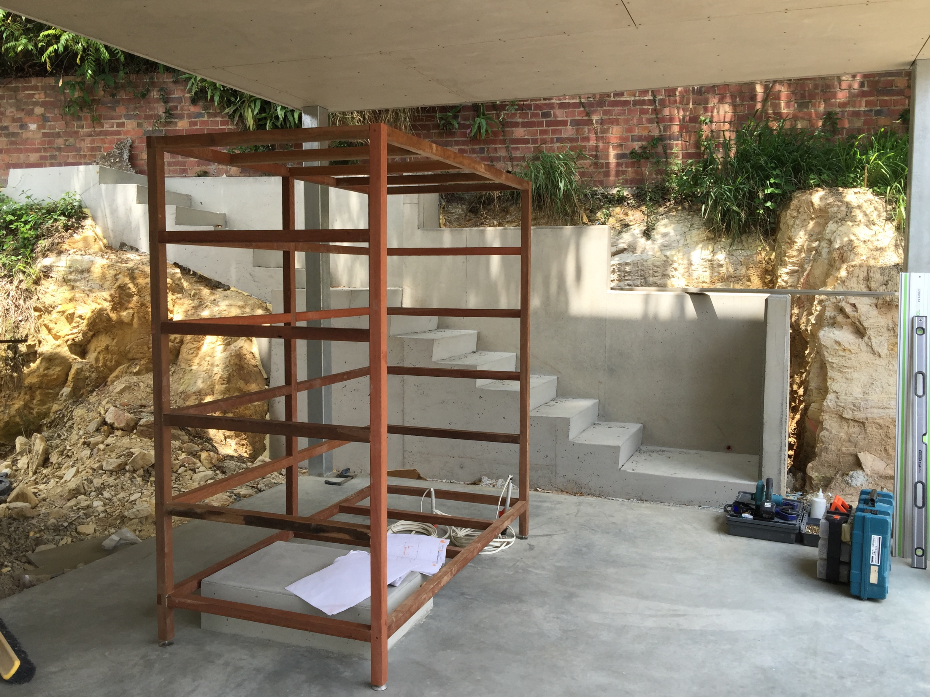 There was also a question over the furniture pieces that I’d had designed and built by the master furniture craftsman, Roy Schack. The vanity unit for the bathroom was an expensive addition to what was already turning out to be a costly room. I wondered how the elegant timber structure he and Shimada san had designed for the space would interact with the large white sink I had chosen. And how it would work with the toilet in the very tight space allocated in the triangular glass bathroom.