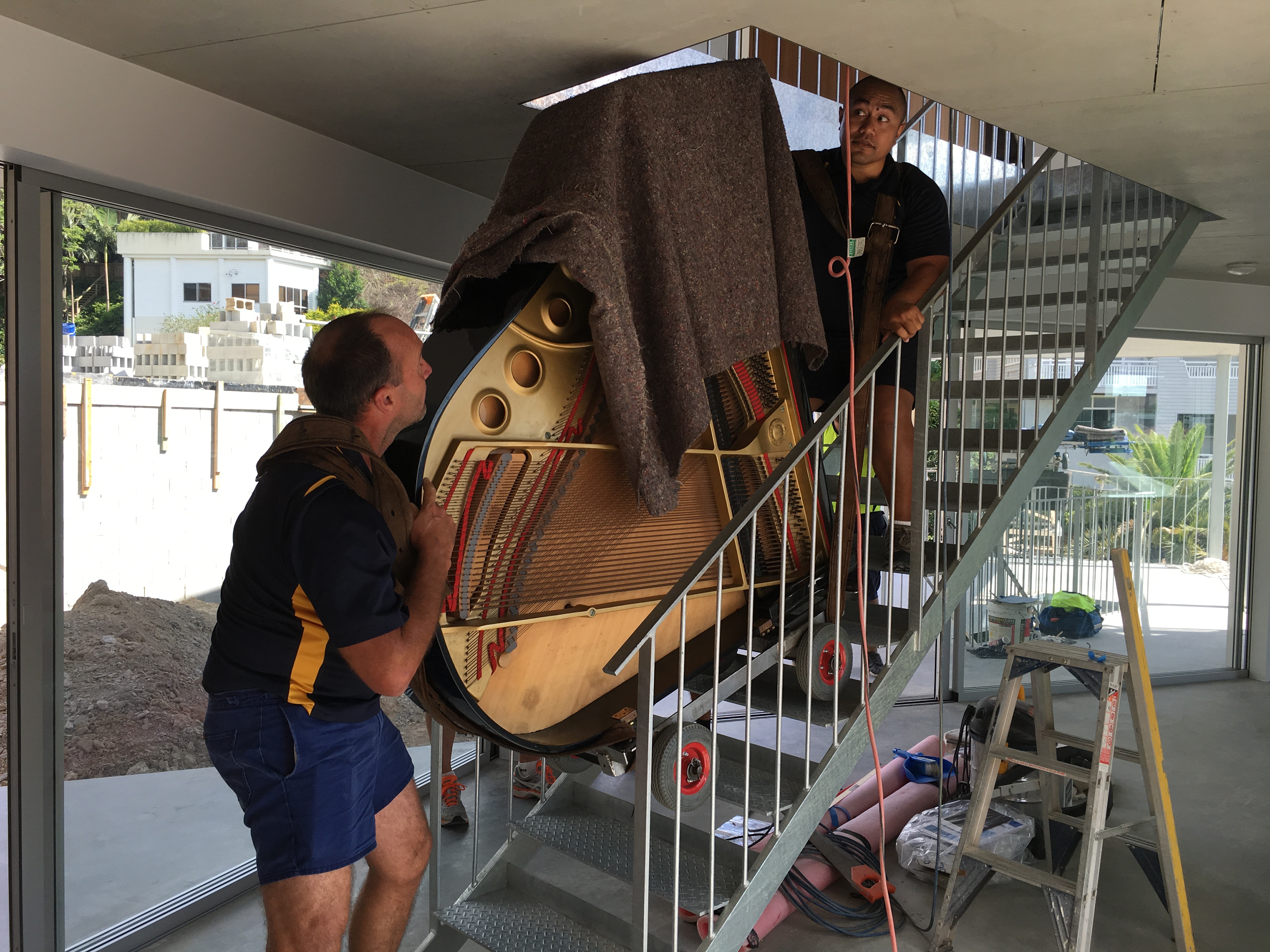 One particular item, however, always had a question over it from the moment it appeared in the design. That moment was late in the piece and the item was my partner Jonny’s baby grand piano. This was never meant to be a house built for a baby grand piano. Life does serve up curve balls though and this one appeared on the scene, thankfully, early enough to give Shimada san time to establish where it would sit (and whether the engineering would handle the weight of it). Getting it into the house, however was another thing altogether. The calculations of where it would fit didn’t take into account the difficulty of craning it onto site and then threading it up the internal stair to the top floor.