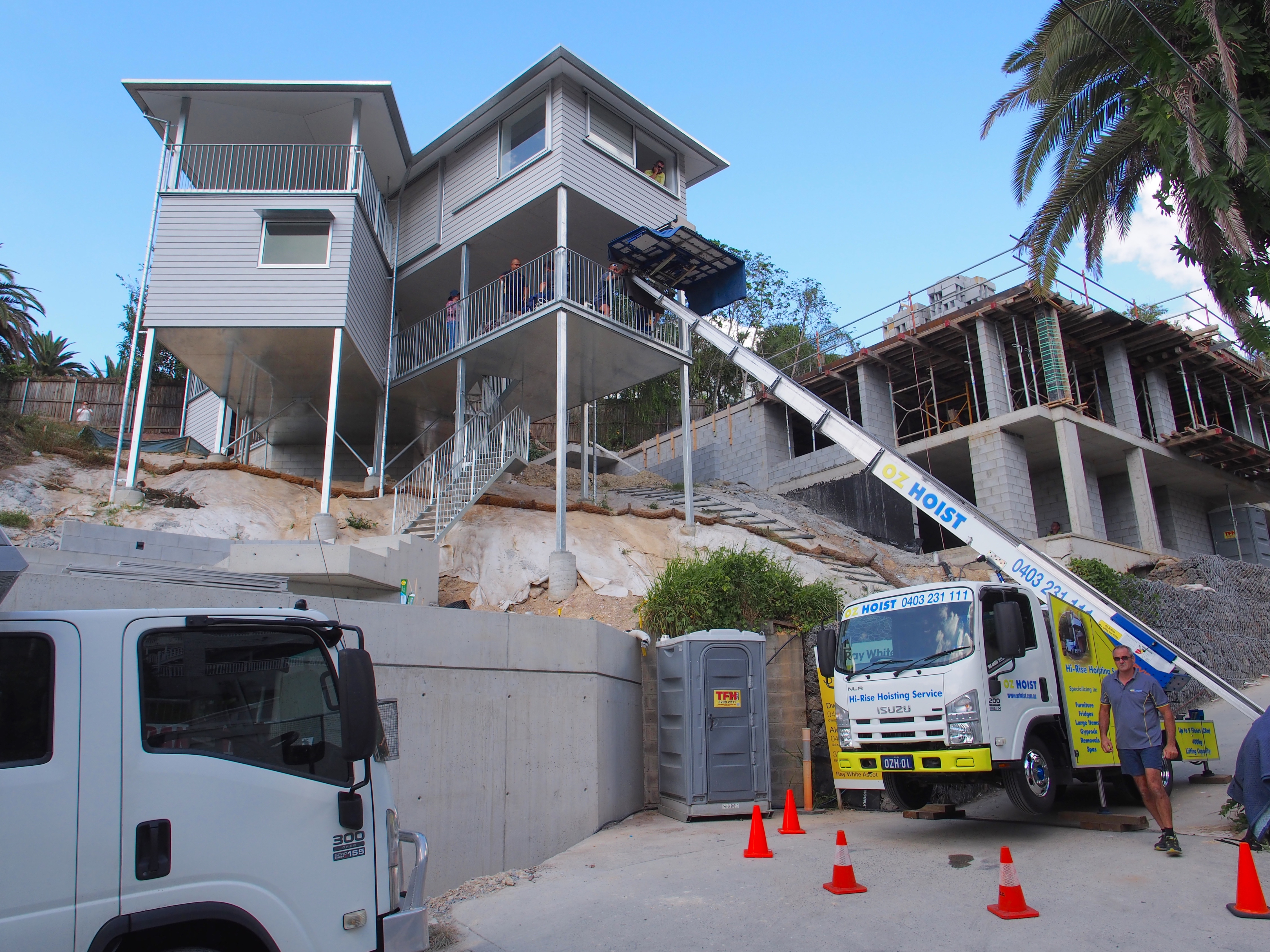 Nobody told me that a crane couldn’t drop an item like that onto the top balcony (without removing the balustrade). Nobody told me that the angle from the street would make it difficult to deliver it safely that way. So onto the first level balcony it went and then, with some careful manoeuvring and heavy lifting, it was slid through the cavity to the second floor with millimetres to spare.