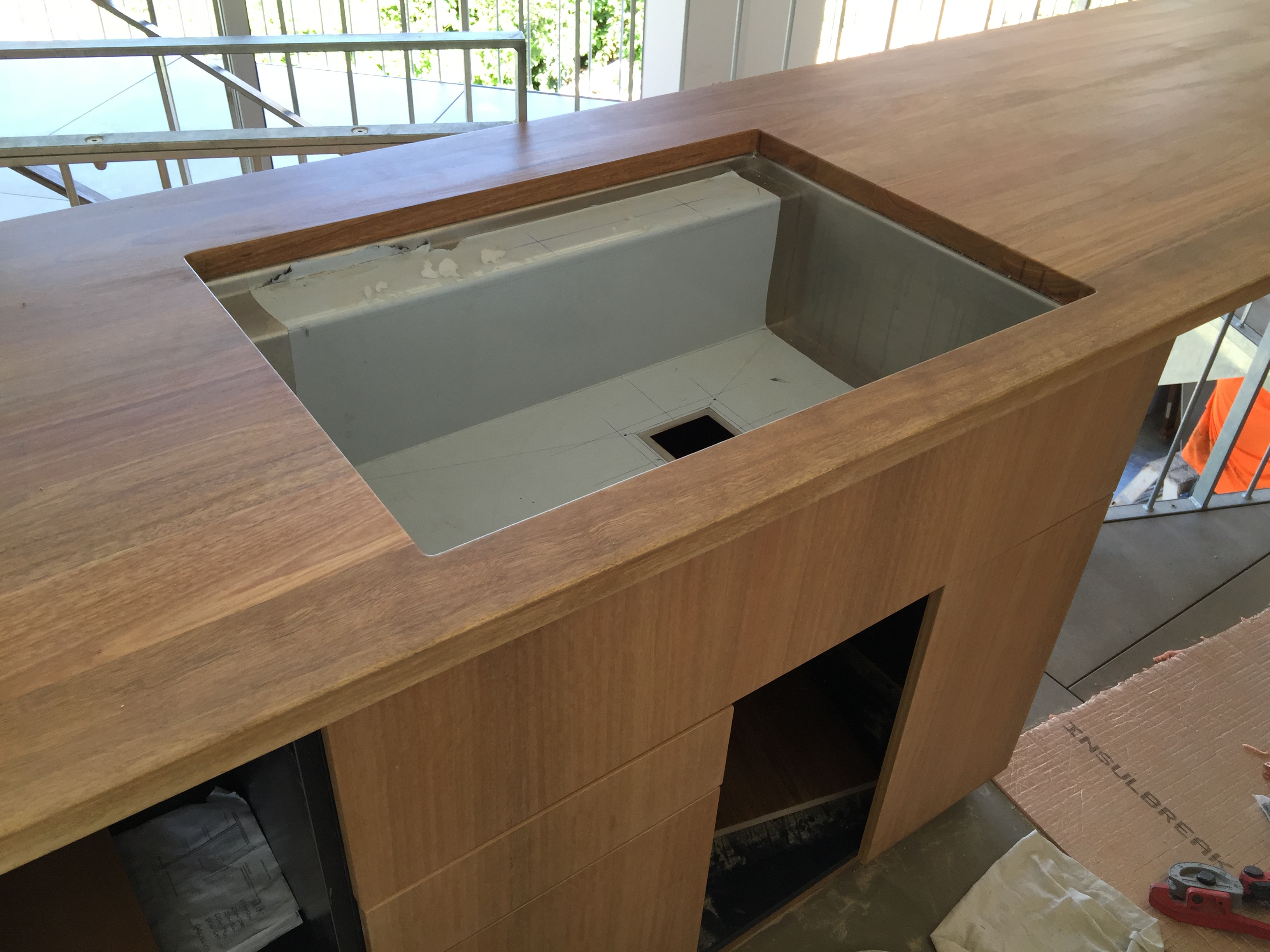 The inset sink, was a question for me. I chose a big one. My rationale was all about maintaining clutter free surfaces. So a big sink with everything below the level of the bench top would give me somewhere to hide the dishes. There is no dishwasher to perform this stowaway function, so if the dishes had to be stashed somewhere during dinner parties, it had to be in this sink. But what would this huge sink look like in such a small house? I wondered all the way up until its installation.
